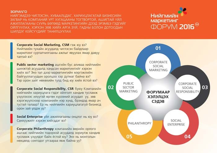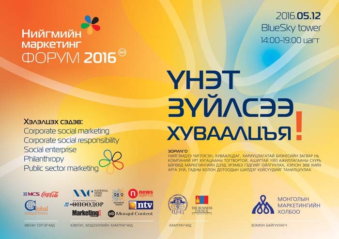 “Үнэт зүйлсээ хуваалцъя” уриатай “Нийгмийн маркетингийн форум” өнгөрөгч долоо хоногт зохион байгуулагдаж бизнесийн байгууллагуудын 400 гаруй төлөөлөл оролцож бизнесийн үр ашгаа нэмэгдүүлэхийн зэрэгцээ нийгмийн сайн сайханд хэрхэн хувь нэмрээ оруулах боломжтой талаар хэлэлцлээ. Томоохон компаниуд, тэдний брэндүүд бүтээгдэхүүний хувьд ялгаагүй болсон тохиолдолд хэрэглэгчдийн 93% нь нийгмийн хариуцлагатайг нь сонгоно гэж судалгааны дүгнэлт гарсныг танилцуулсан нь нийгмийн маркетингийн ач холбогдлыг илэрхийлж, ийнхүү олон тооны мэргэжилтнүүд нэгэн танхимд мэдээлэл, туршлагаа хуваалцах шалтгаан болсон юм.