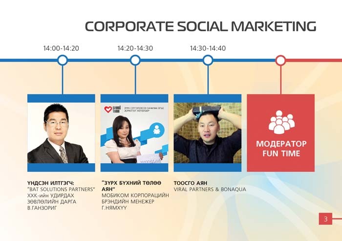 Өнгөрсөн жил л гэхэд гадны сурталчилгаа, кейстэй танилцаж байсан “Нийгмийн маркетингийн форум” энэ жил дотоодын амжилттай кейсүүдээ ийнхүү хэлэлцсэн нь манай компаниуд илүү хариуцлагатай болж байгаагийн илрэл. Цаашлаад нийгмээ судлах, өнөөдөр юу хамгийн чухал асуудал вэ гэдгийг ойлгох, улмаар манай хэрэглэгчийн хувд энэ нь хэр зэрэг ач холбогдолтой вэ гэдгийг судлах зайлшгүй шаардлагатай. Нийгмийн, асуудал дэвшүүлсэн реклам бүтээж, түүнийгээ брэндтэйгээ уяж хариуцлагатай маркетинг хийх нь маркетингийн дараачийн шат хэдийнэ болжээ.